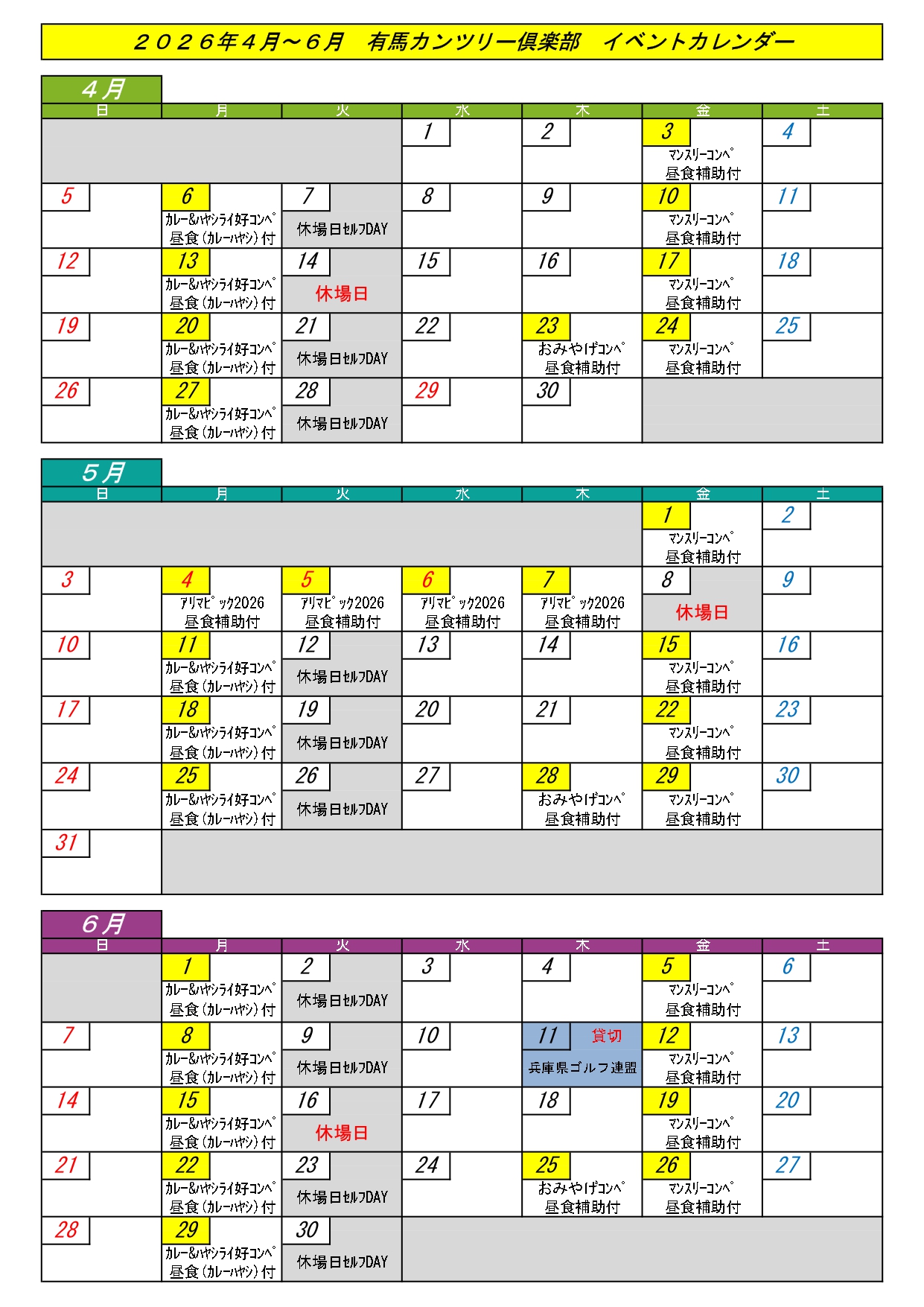 2026年3月25日(水) - 有馬カンツリー倶楽部からのお知らせ