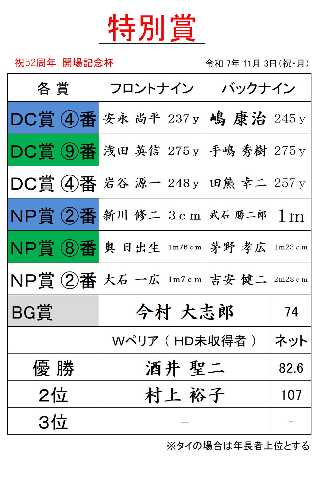 11月3日(祝・月)祝52周年 開場記念杯(特別賞)