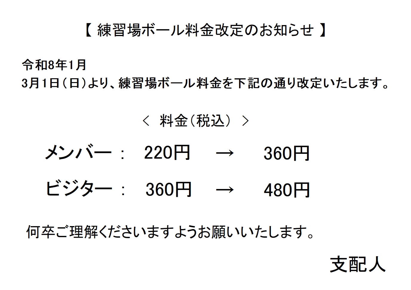 3月1日(日)より、練習場ボール料金を改定いたします。