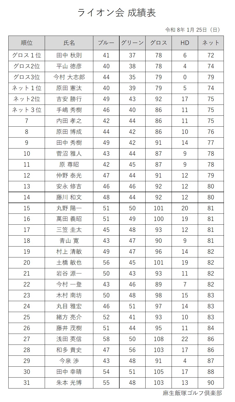 1月25日(日)ライオン会成績表